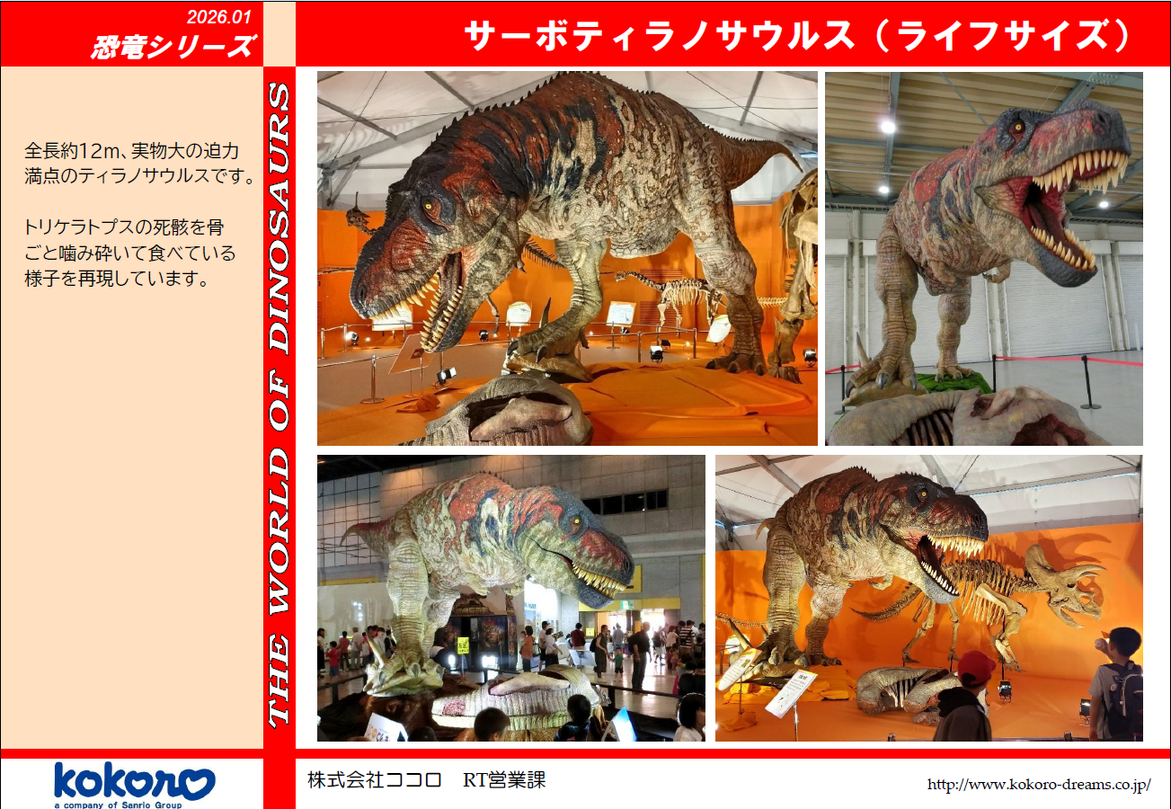 全恐竜シリーズの解説と動作の説明、三面図、重量、必要電源、等ご覧いただけます。稼働状況等、お気軽にお問い合わせください。楽しく遊べるプレイ恐竜2種類が加わりました。